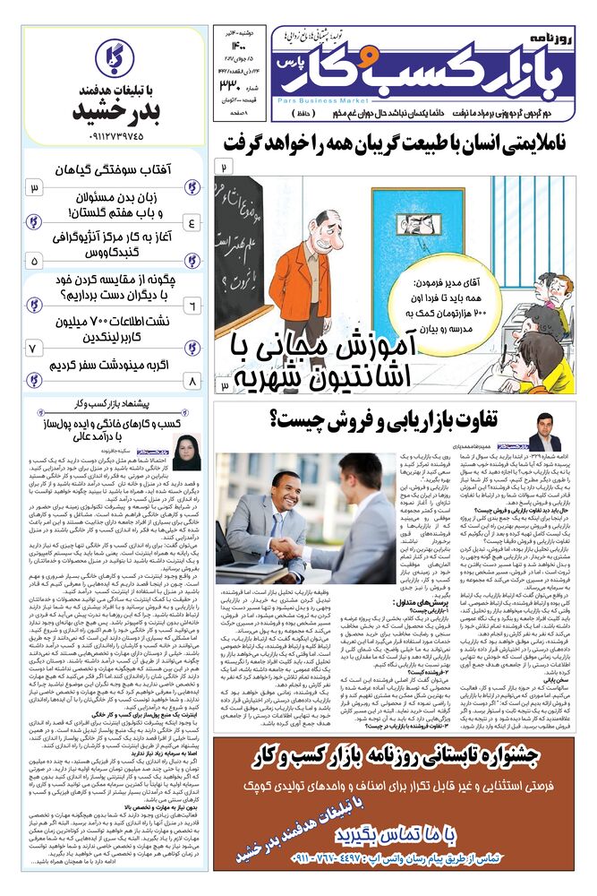 ‫تولید؛ ابیتشپنی اه؛ مانع زدایی اه‬ ‫روزنامه‬ ‫دوشنبه ‪ 14 -‬تیر‬ ‫‪1400‬‬ ‫‪ /5‬جوالی‪2021/‬‬ ‫‪ /24‬ذی القعده‪1442/‬‬ ‫شماره‬ ‫دور گردون گر دو روزی بر مراد ما نرفت دائما یکسان نباشد حال دوران غم مخور‬ ‫‪330‬‬ ‫با تبلیغات هدفمند‬ ‫بدرخشید‬ ‫قیمت‪ 2000 :‬تومان‬ ‫( حافظ )‬ ‫‪ 8‬صفحه‬ ‫نامالیمتی انسان با طبیعت گریبان همه را خواهد گرفت‬ ‫‪09112739745‬‬ ‫افتاب سوختگی گیاهان‬ ‫‪2‬‬ ‫‪4‬‬ ‫اقای مدیر فرمودن‪:‬‬ ‫همه باید تا فردا اون‬ ‫‪6‬‬ ‫‪ 200‬هزارتومان کمک به‬ ‫مدرسه رو بیارن‬ ‫اموزش مجانی با‬ ‫اشانتیون شهریه‬ ‫‪3‬‬ ‫تفاوت بازاریابی و فروش چیست؟‬ ‫حمیدرضامحمدیاری‬ ‫ادامــه شــماره ‪ -329‬در ابتــدا بزاریــد یــک ســوال از شــما‬ ‫پرســیده شــود کــه ایــا شــما یــک فروشــنده خــوب هســتید‬ ‫یــا نــه یــک بازاریــاب خــوب؟ یــا اجــازه دهیــد کــه یــه ســوال‬ ‫را طــوری دیگــر مطــرح کنیــم‪ ،‬کســب و کار شــما نیــاز‬ ‫بــه یــک بازاریــاب دارد یــا یــک فروشــنده؟ ایــن امــوزش‬ ‫قــادر اســت کلیــه ســواالت شــما رو در ارتبــاط بــا تفــاوت‬ ‫بازاریابــی و فــروش پاســخ دهــد‪.‬‬ ‫حال باید دید تفاوت بازاریابی و فروش چیست؟‬ ‫در اینجــا بــرای اینکــه بــه یــک جمــع بندی کلــی از پروژه‬ ‫بازاریابــی و فــرروش برســیم بهتریــن راه ایــن اســت کــه‬ ‫یــک لیســت کامــل تهیــه کــرده و بعــد از ان بگوئیــم کــه‬ ‫تفــاوت بازاریابــی و فــروش دقیقــا چیســت؟‬ ‫بازاریابــی تحلیــل بــازار بــوده‪ ،‬اما فــروش‪ ،‬تبدیل کردن‬ ‫مشــتری بــه خریــدار‪ .‬در بازاریابــی هیــچ گونــه وجهــی رد‬ ‫و بــدل نخواهــد شــد و تنهــا مســیر دســت یافتــن بــه‬ ‫ثــروت اســت ‪ ،‬امــا در فــروش‪ ،‬مســیر مشــخص بــوده و‬ ‫فروشــنده در مســیری حرکــت می کنــد کــه مجموعــه رو‬ ‫بــه ســرمایه می رســاند‪.‬‬ ‫در وافــع می تــوان گفــت کــه ارتبــاط بازاریــاب‪ ،‬یــک ارتبــاط‬ ‫کلــی بــوده و ارتبــاط فروشــنده‪ ،‬یــک ارتبــاط خصوصــی‪ .‬امــا‬ ‫وقتــی کــه یــک بازاریــاب میخواهــد بــازار رو تحلیــل کنــد‪،‬‬ ‫بایــد کلیــت افــراد جامعــه رو بنگــرد و یــک نــگاه عمومــی‬ ‫داشــته باشــد‪ ،‬امــا یــک فروشــنده تمــام تــاش خــود را‬ ‫می کنــد کــه نفــر بــه نفــر کارش رو انجــام دهــد‪.‬‬ ‫فروشــنده‪ ،‬زمانــی موفــق خواهــد بــود کــه بازاریــاب‬ ‫داده هــای درســتی را در اختیــارش قــرار داده باشــد و‬ ‫بازاریــاب زمانــی موفــق اســت کــه خــودش بــه تنهایــی‬ ‫اطالعــات درســتی را از جامعــه ی هــدف جمــع اوری‬ ‫کــرده باشــد‪.‬‬ ‫سخن پایانی‬ ‫سالهاســت کــه در حــوزه بــازار کســب و کار‪ ،‬فعالیــت‬ ‫می کنیــم‪ .‬امــا مــوردی کــه می توانیــم در ارتباط بــا بازاریابی‬ ‫و فــروش ارائــه بدیــم ایــن اســت کــه‪ ” :‬اگــر دوســت داریــد‬ ‫کــه کارتــون بــه یــک نتیجــه ثابــت و اســتوار برســد‪ .‬و اگــر‬ ‫عالقه مندیــد کــه کار شــما دیــده شــود و در نتیجــه بــه یک‬ ‫فــروش مطلــوب برســید‪ .‬قبــل از اینکــه وارد بــازار شــوید‪،‬‬ ‫‪8‬‬ ‫زبان بدن مسئوالن‬ ‫و باب هفتم گلستان!‬ ‫اغاز به کار مرکز انژیوگرافی‬ ‫گنبدکاووس‬ ‫چگونه از مقایسه کردن خود‬ ‫با دیگران دست برداریم؟‬ ‫نشت اطالعات ‪ 700‬میلیون‬ ‫کاربر لینکد ین‬ ‫اگربه مینودشت سفر کردیم‬ ‫‪3‬‬ ‫‪5‬‬ ‫‪7‬‬ ‫پیشنهاد بازار کسب و کار‬ ‫کسب و کارهای خانگی و ایده پول ساز‬ ‫با درامد عالی‬ ‫سکینه جافرنوده‬ ‫روی یــک بازاریــاب و یــک‬ ‫فروشــنده تمرکــز کنیــد و‬ ‫ســعی کنیــد از بهترین هــا‬ ‫بهــره بگیریــد‪.”.‬‬ ‫بازاریابــی و فــروش‪ ،‬این‬ ‫روزهــا 
