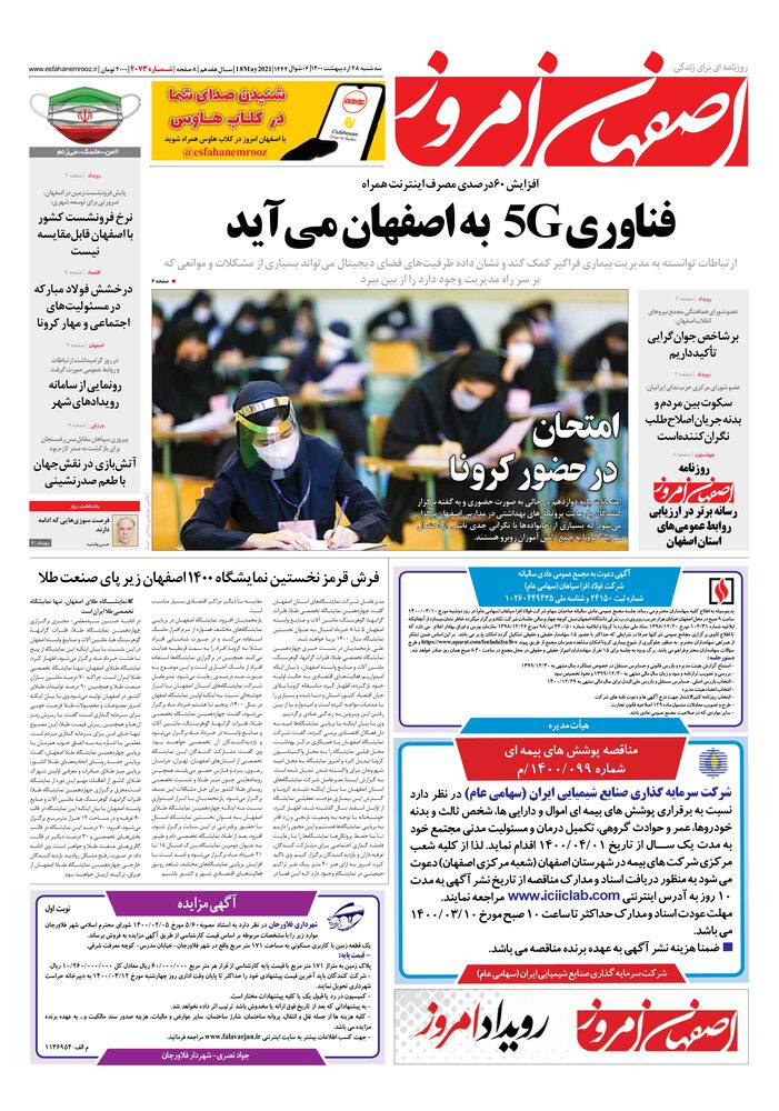سه شنبه 28اردیبهشت 06 |1400شوال | 18May2021| 1442سـال هفدهم | 8صفحه | شـمـاره 2000 | 4073تومان | www.esfahanemrooz.ir