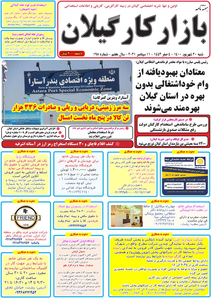 شنبه 20شهریور 4 - 1400صفر 11 - 1443سپتامبر - 2021سال هفتم -شماره 195