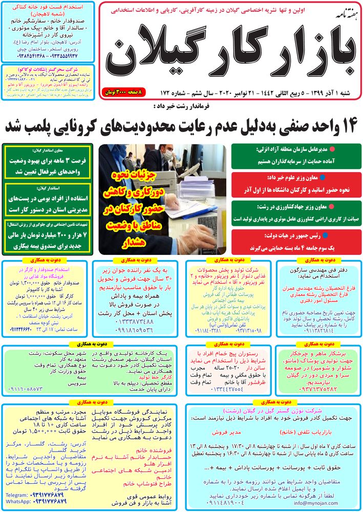 شنبه 1اذر 5 - 1399ربیع الثانی 21 - 1442نوامبر - 2020سال ششم -شماره 172