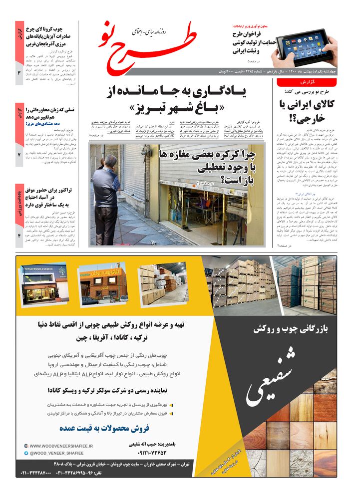 چهار شنبه یکم اردیبهشت ماه - 1400سال پانزدهم -شماره - 2175قیمت 2000تومان