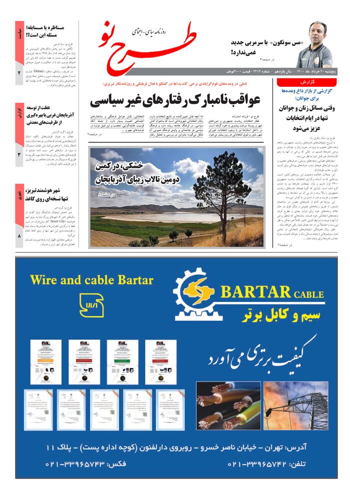 پنج شنبه 20خرداد ماه - 1400سال پانزدهم -شماره - 2214قیمت 2000تومان