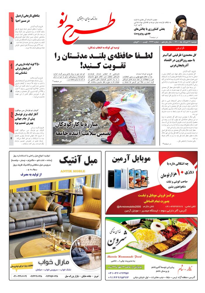 دوشنبه 31خرداد ماه - 1400سال پانزدهم -شماره - 2223قیمت 2000تومان
