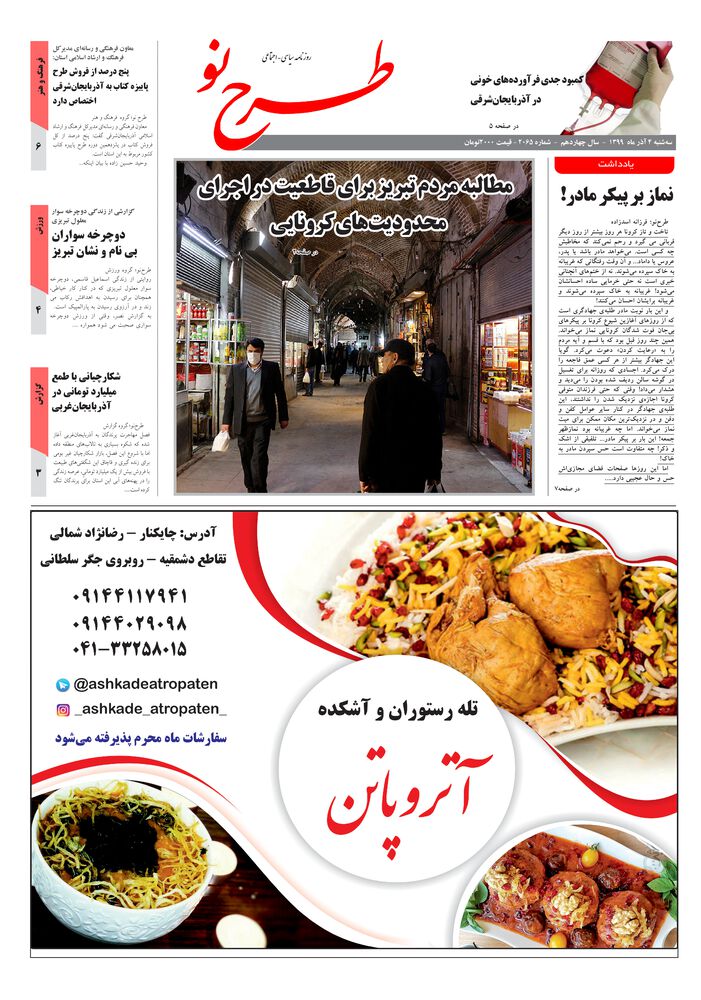 سه شنبه 4اذر ماه - 1399سال چهاردهم -شماره - 2065قیمت 2000تومان