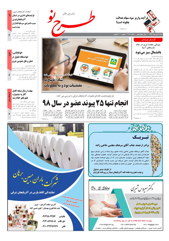 شنبه 6دی ماه - 1399سال چهاردهم -شماره - 2092قیمت 2000تومان